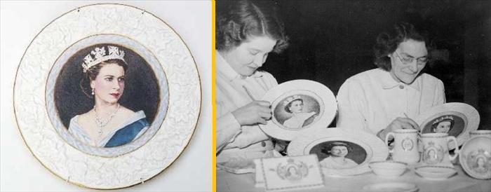 The photo also shows some of the standard transfer-printed pieces which were produced in huge quantities to mark the occasion. The late Marion Robinson was given the task of touching up any pieces whose transfers had been damaged during the manufacturing process. As she jokingly put it: "I put lipstick on the Queen!".