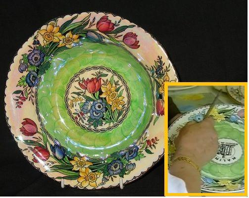 The "Springtime" pattern shown here was used as the basis of souvenir plates produced for a 1997 exhibition in Newcastle - decades after Maling had closed its doors. The central floral motif is replaced by a supersized Maling castle logo by way of tribute. (See insert.)
