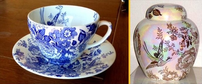 Both these Maling pieces are much later in date - 20th century. On the right we have 'Pheasant, Old Gold' - a typical example of the pottery re-working an old pattern to suit changing tastes. The large cup and saucer are known as 'Jumbo' ware (for obvious reasons). More on this in newsletter 16. So that's your first bonus letter - "J" for Jumbo.