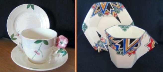They do exist (see left pic). We suggest the answer to this puzzle lies in the handles which, while decorative, were not user-friendly. Nobody wants to spill scalding hot tea over themself, so the cups were probably withdrawn from production. The same fate befell items in the contemporaneous 1930s Jazz range (right).